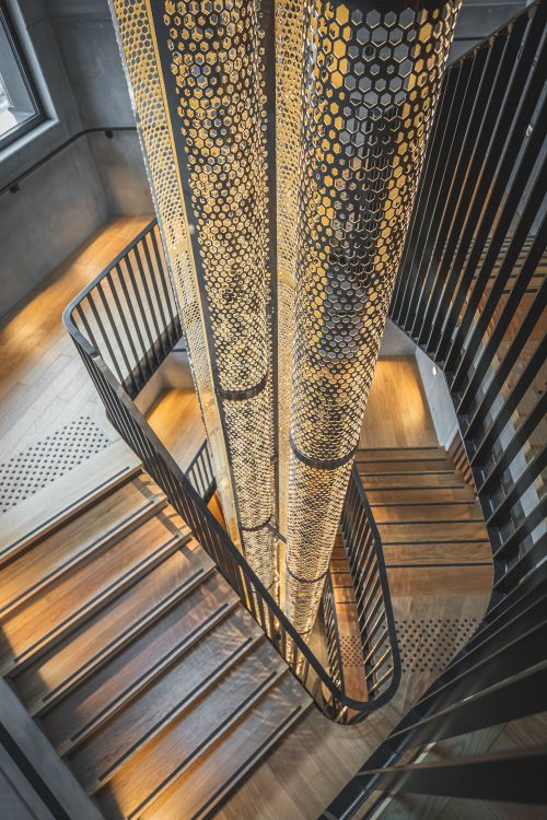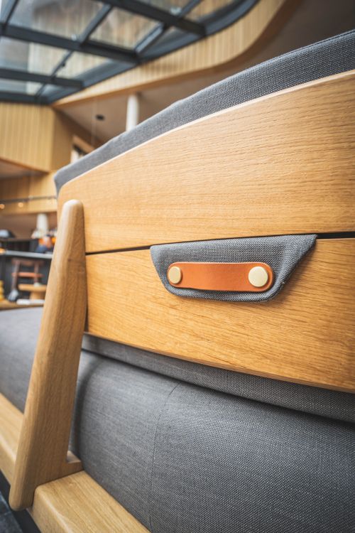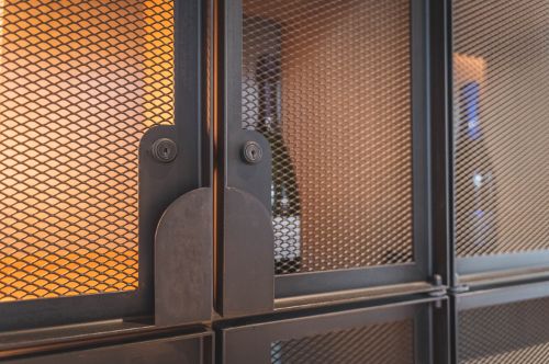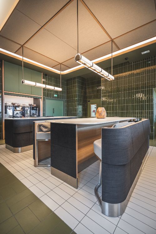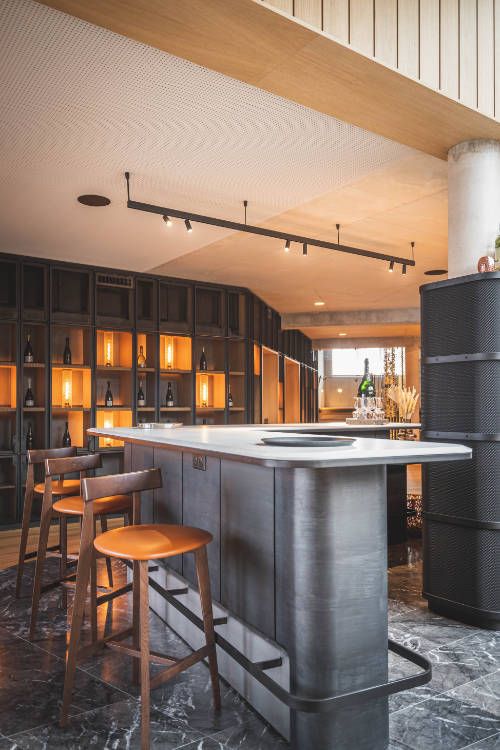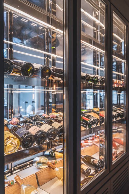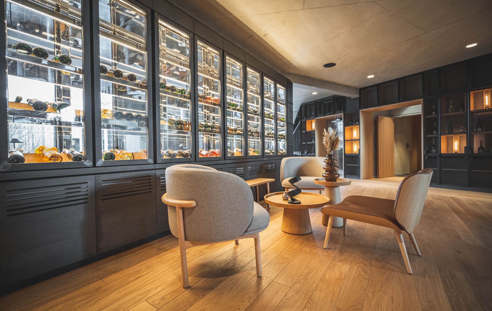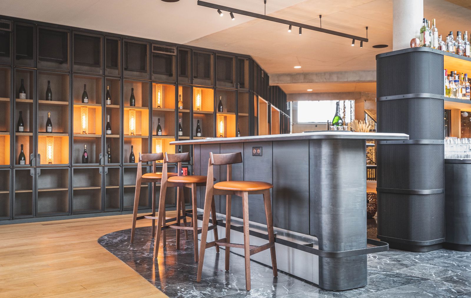 Réalisation des agencements bar, comptoirs de dégustation, vitrines de présentation et desk accueil, stations show cooking, tables du Chef, vitrines réfrigérées, étagères murales. Ensembles en chêne verni & acier oxydé « bronze médaille », plafonds acoustiques en tissus, intégration des plans en pierre et ouvrages de sellerie en cuir.