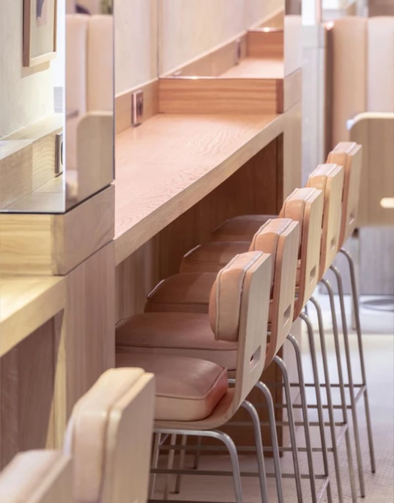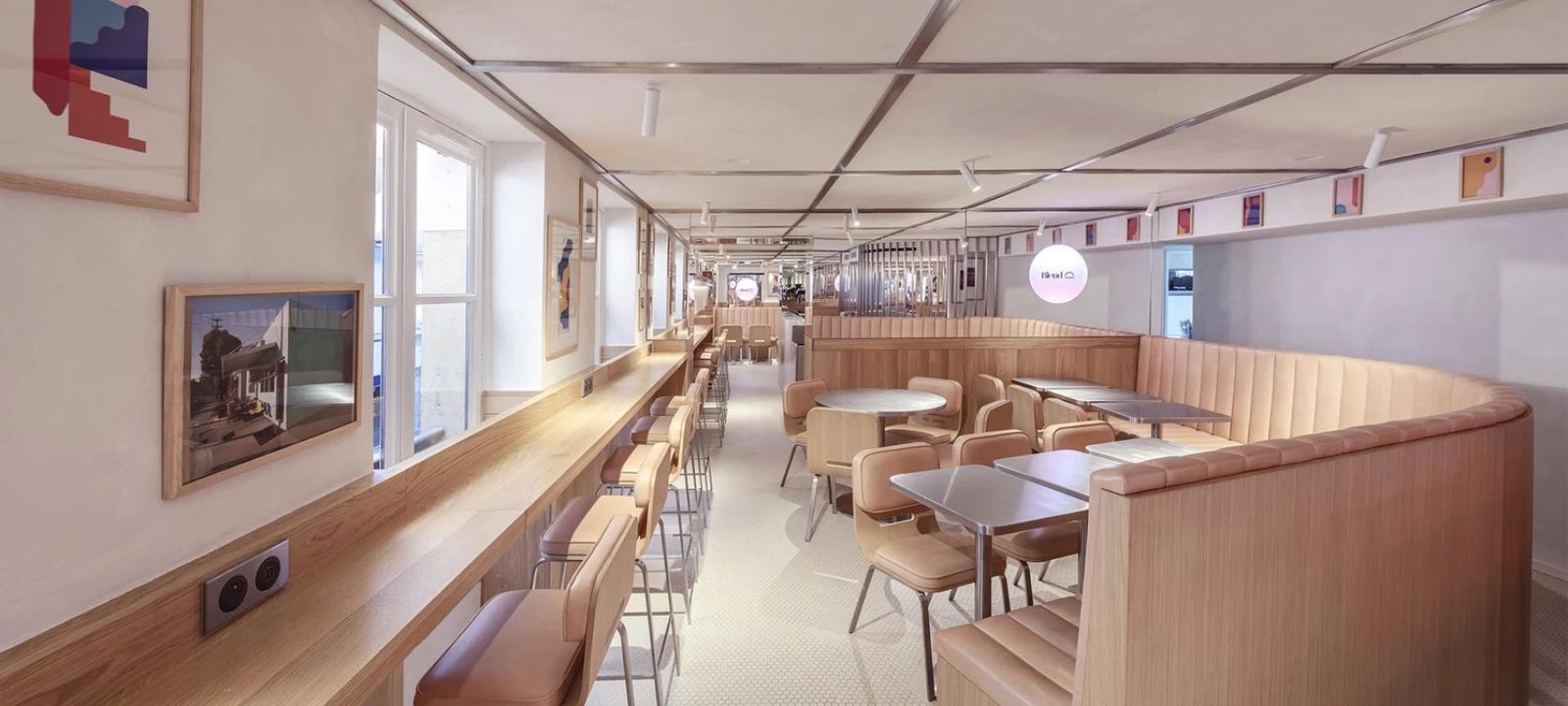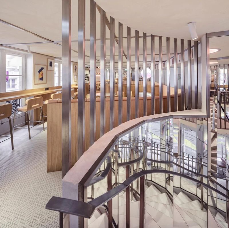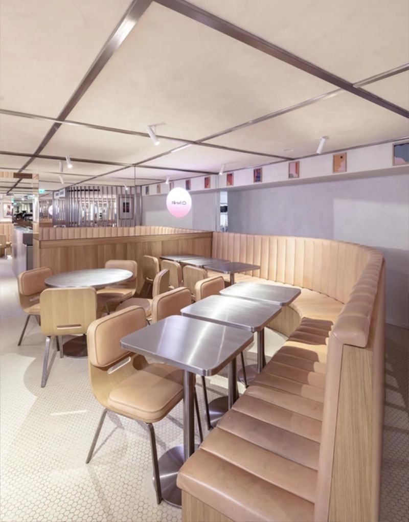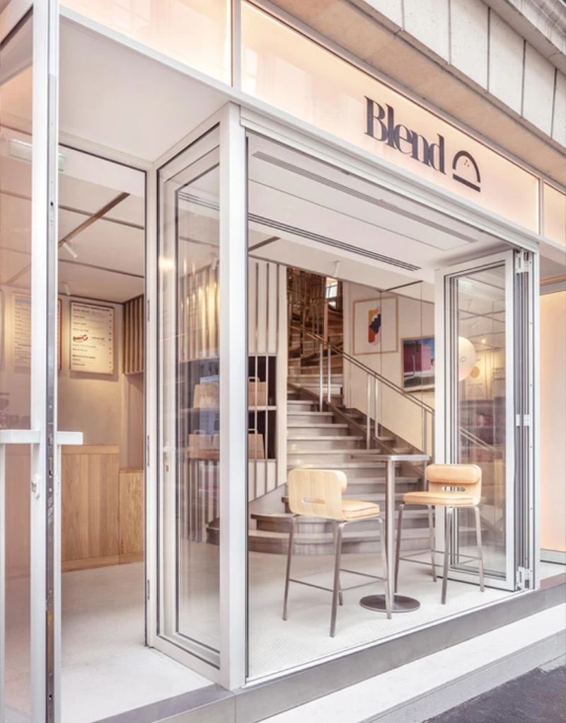 Agencement du Restaurant Blend Madeleine à Paris. Mobiliers et banquettes en placage chêne et chêne massif, selleries en simili-cuir, miroiterie.