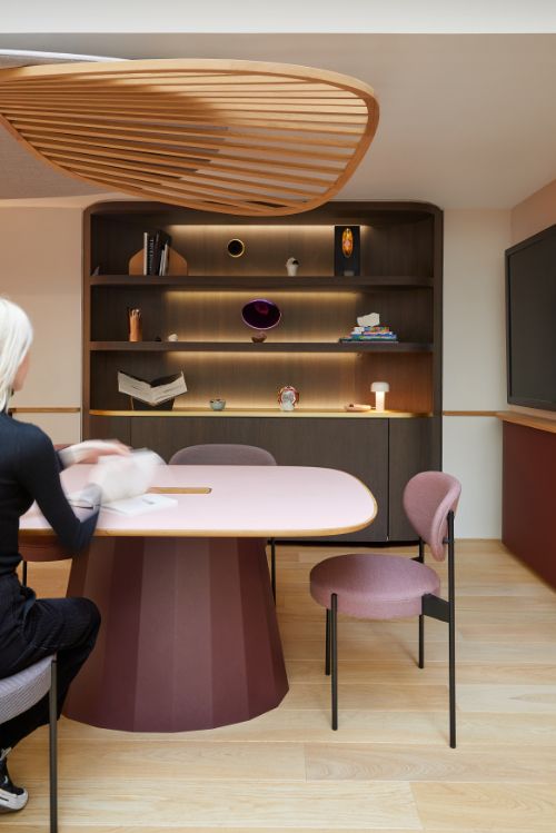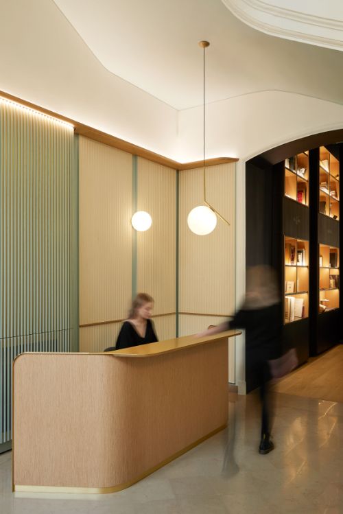 Cloisons en chêne massif et placage « Marotte X Tabu », verres striés, plafonniers, assises et coussins en tissus, muraux avec panneaux acoustiques « Timber InLab » Accueil en placage chêne, résine et panneaux décoratifs « Panbeton Concrete LCDA », bibliothèques, intégration de de plateaux laiton, rideaux.