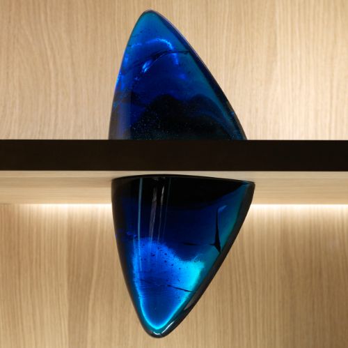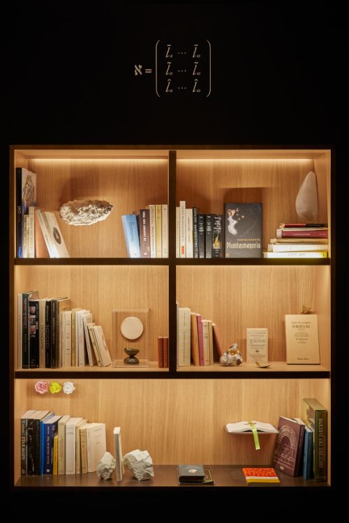 Cloisons en chêne massif et placage « Marotte X Tabu », verres striés, plafonniers, assises et coussins en tissus, muraux avec panneaux acoustiques « Timber InLab » Accueil en placage chêne, résine et panneaux décoratifs « Panbeton Concrete LCDA », bibliothèques, intégration de de plateaux laiton, rideaux.