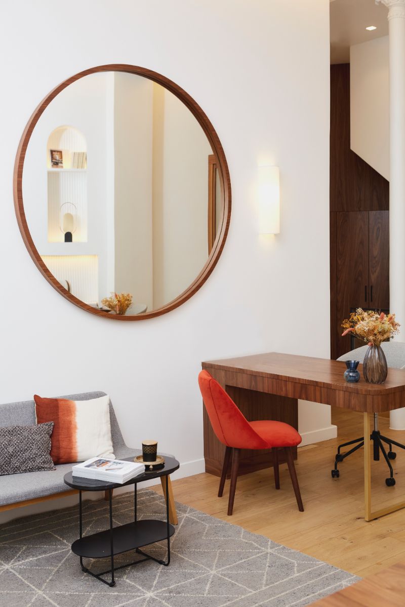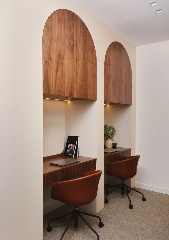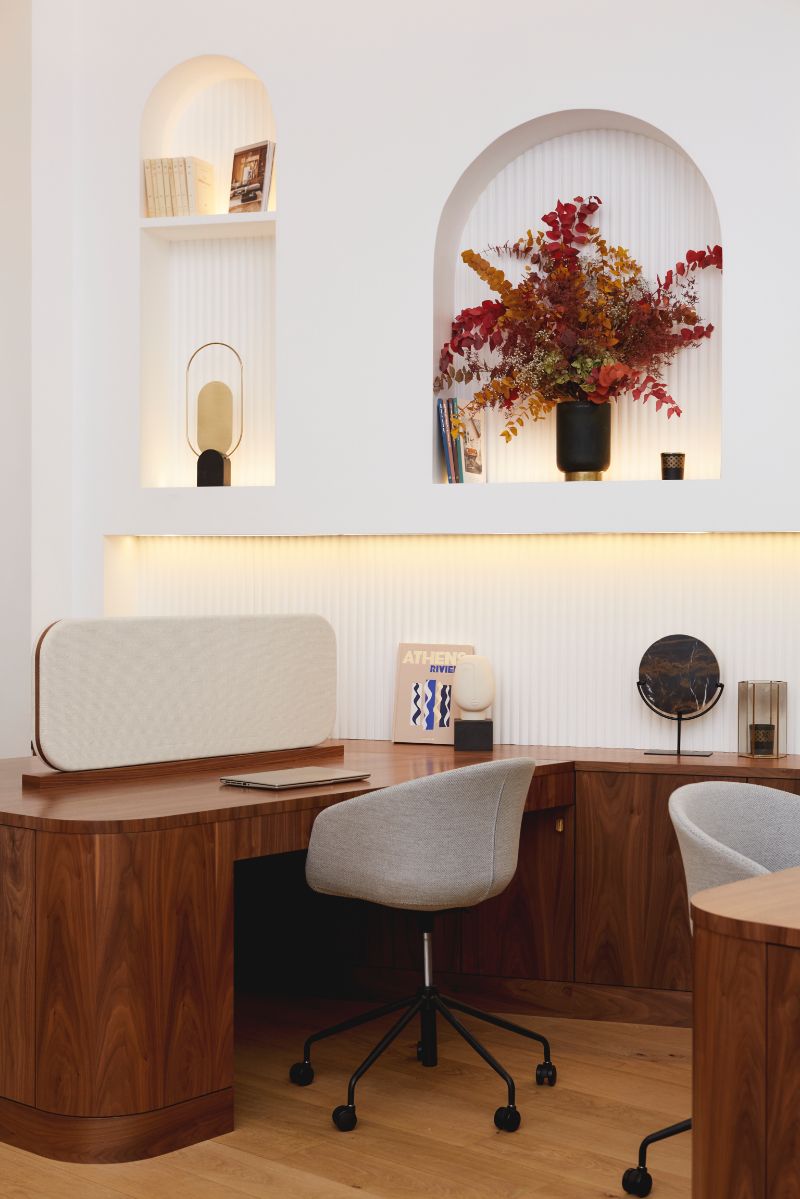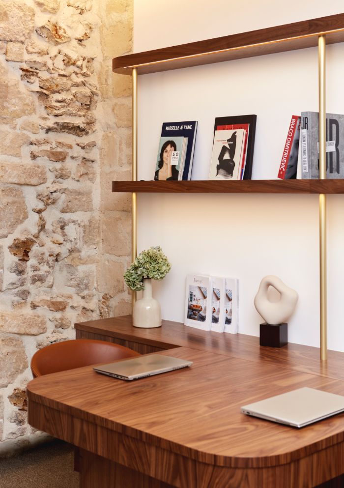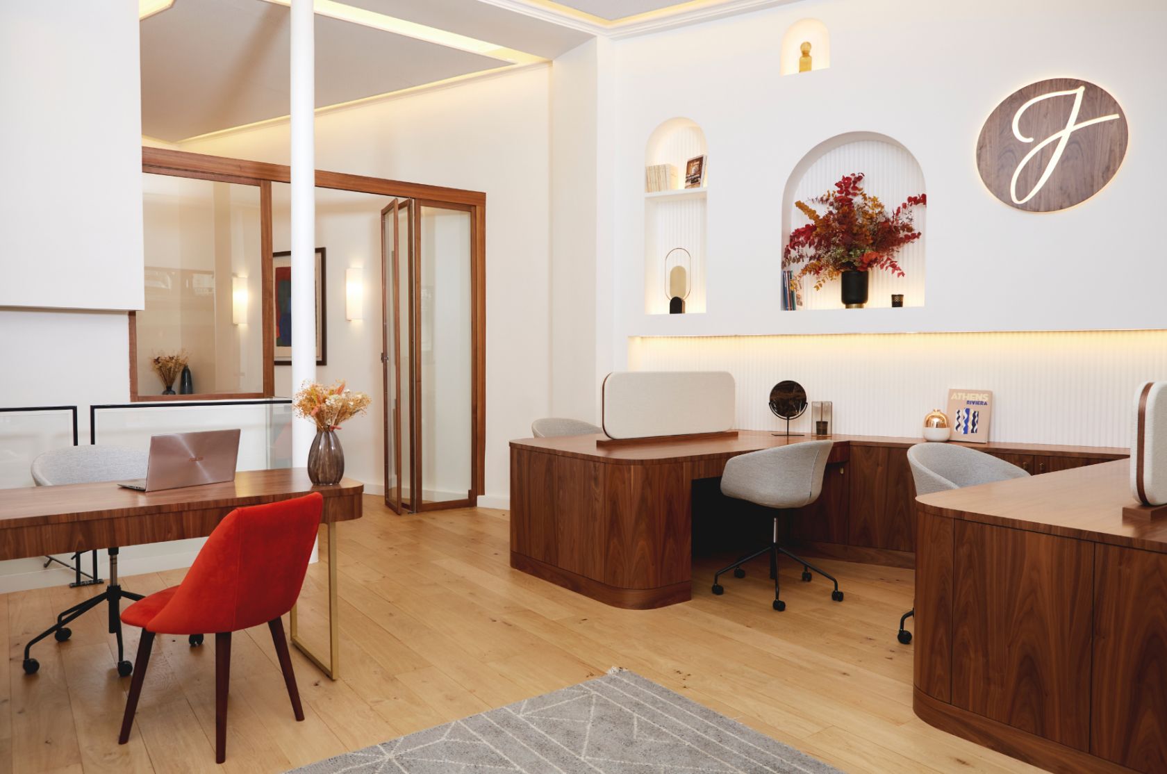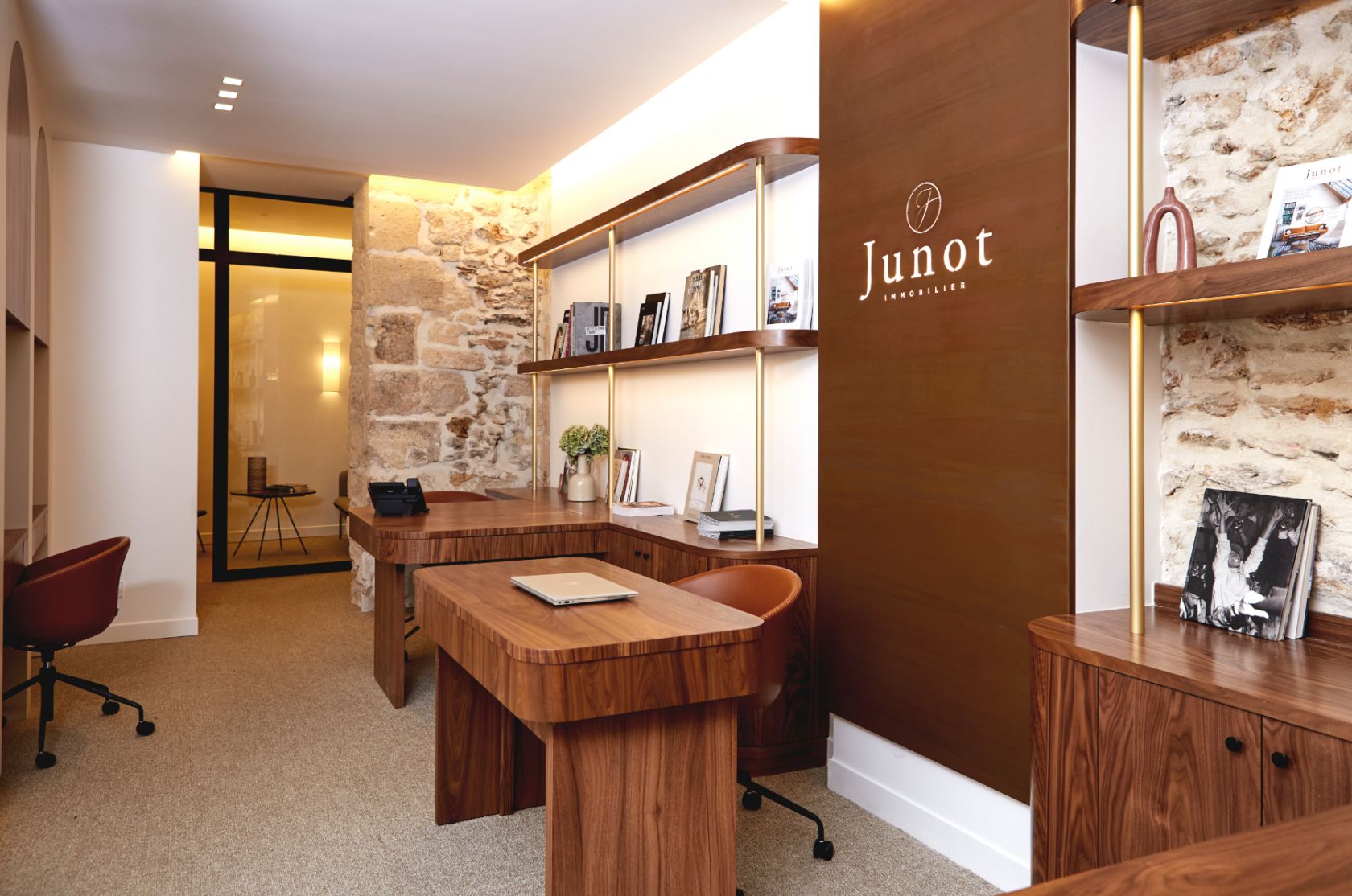 Réalisation de 14 agences immobilières, agencements des bureaux collaborateurs, des meubles de rangements et des bibliothèques en placage noyer US vernis, tubes et pieds en laiton massif ou laqué.