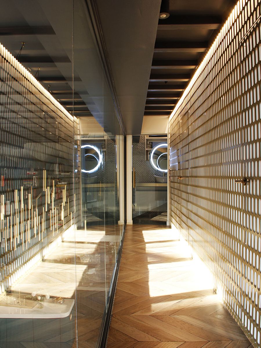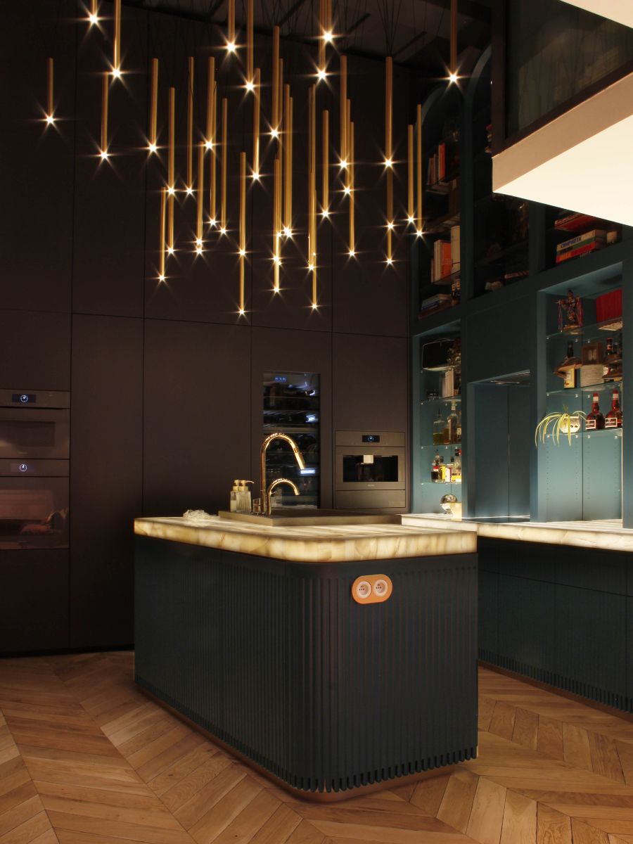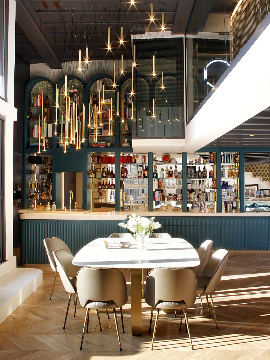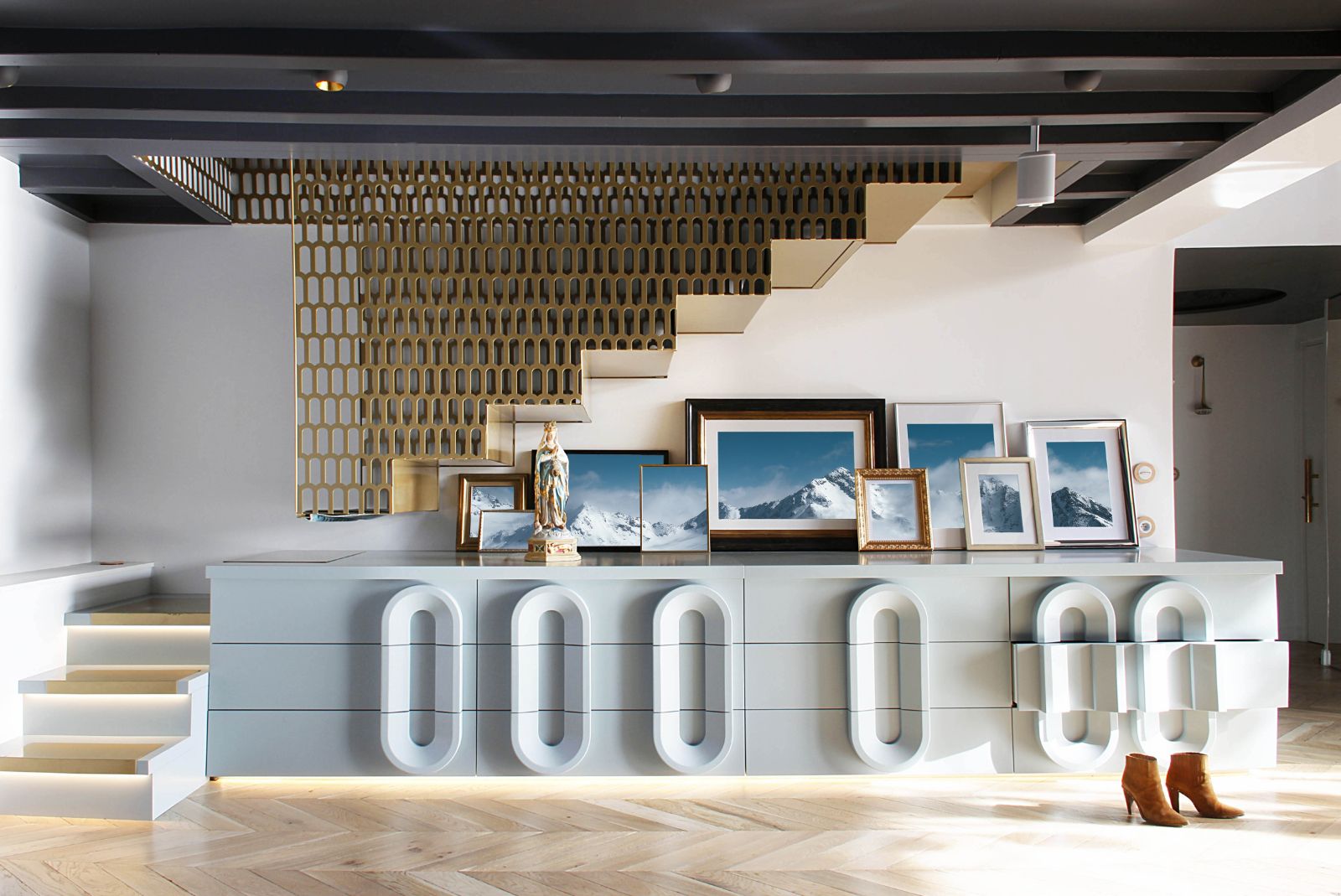Mobiliers de la cuisine, du salon, des chambres et des salles de bain. Ensembles mobiliers en médium laqué et stratifié, lambris laqués, intégration de miroiterie, plans de travail de la cuisine et des salles de bain en Onyx rétro-éclairé.