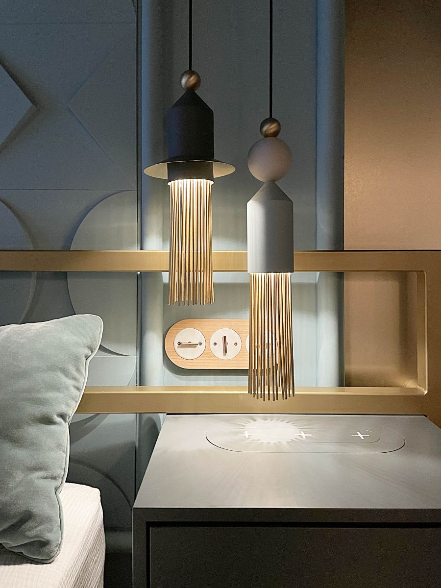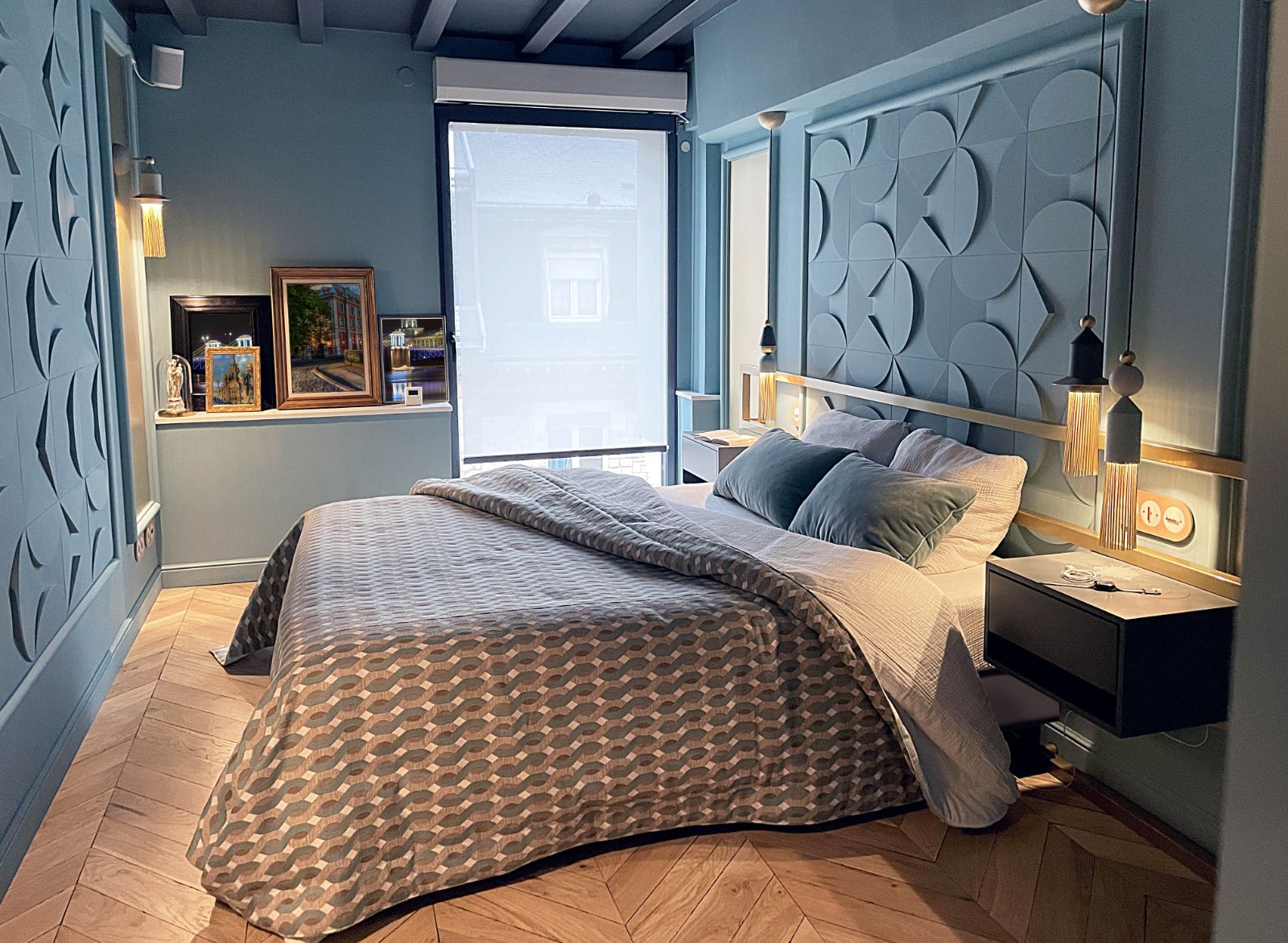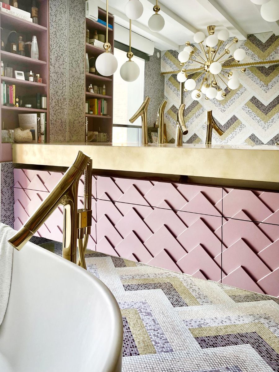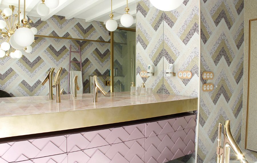 Mobiliers de la cuisine, du salon, des chambres et des salles de bain. Ensembles mobiliers en médium laqué et stratifié, lambris laqués, intégration de miroiterie, plans de travail de la cuisine et des salles de bain en Onyx rétro-éclairé.