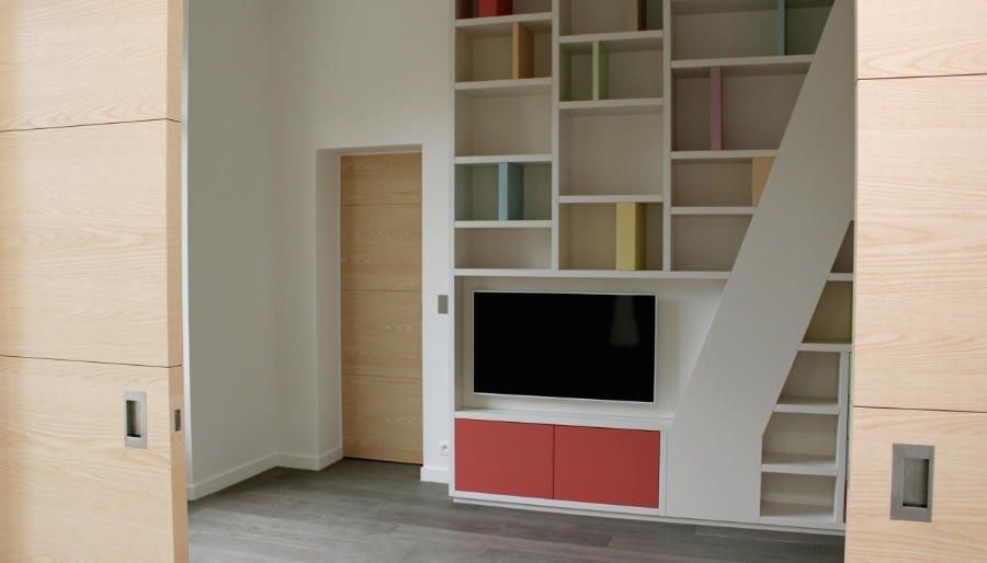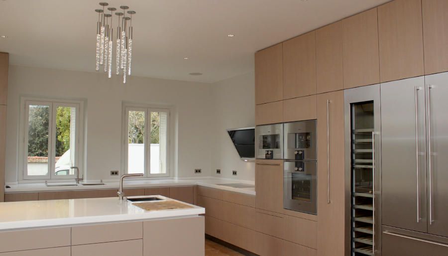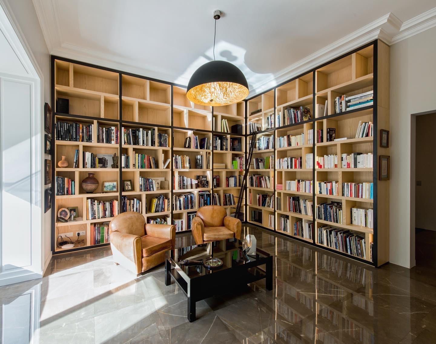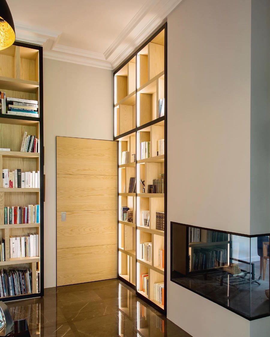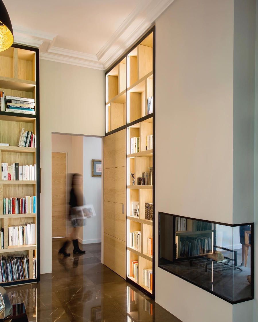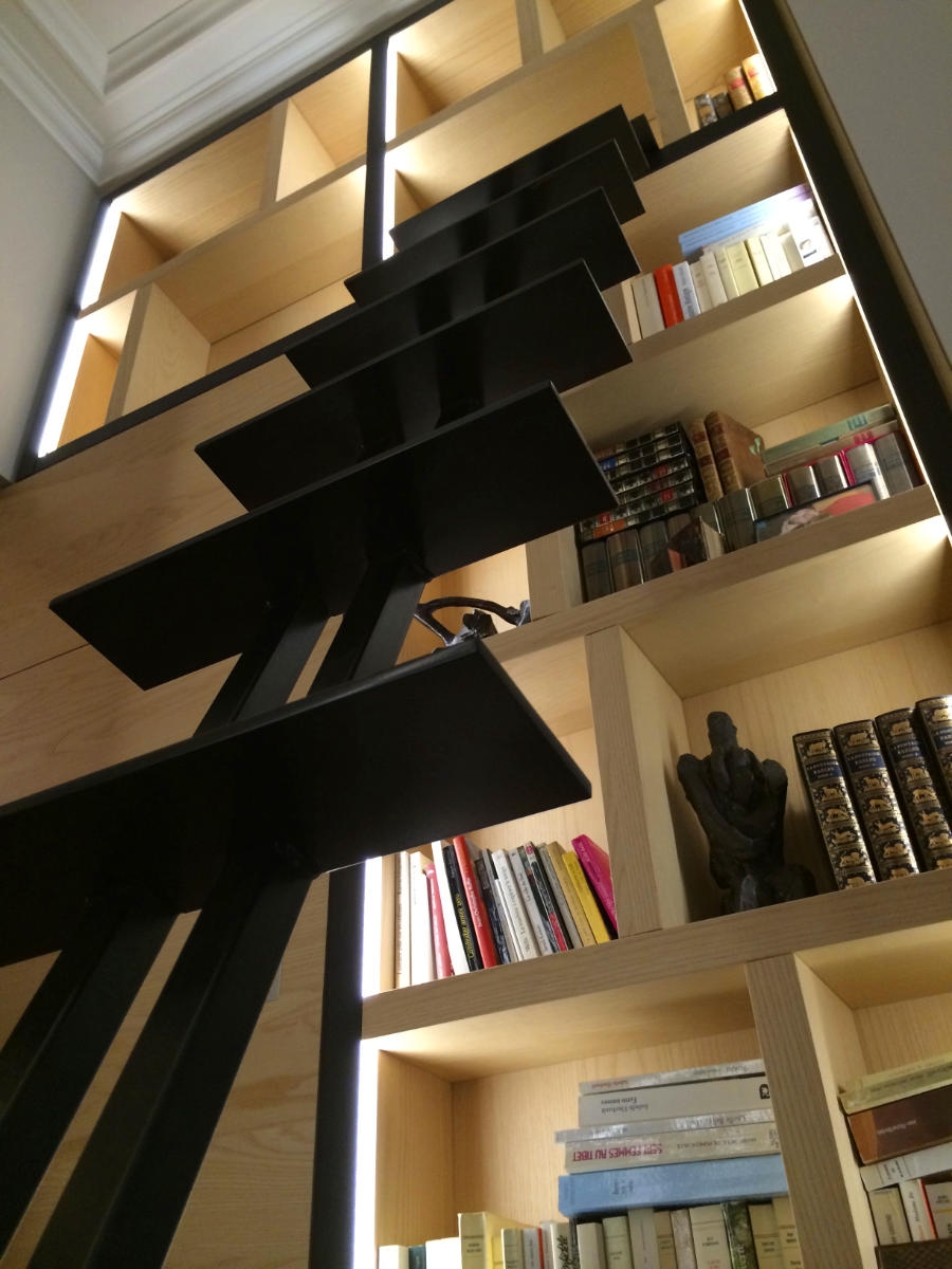 Aménagement d’une Villa de maître à Neuilly-sur-Seine. Mobiliers sur mesure - bibliothèque en frêne mat et acier vieilli, cuisine en placage et résine. Portes pivotantes invisibles Elezio.