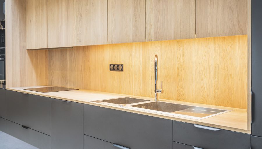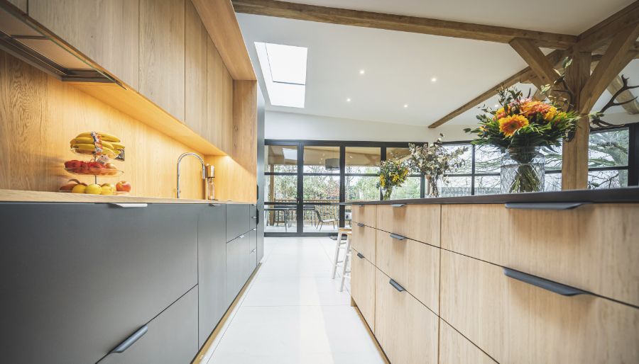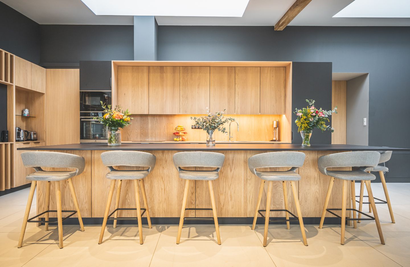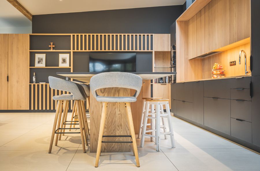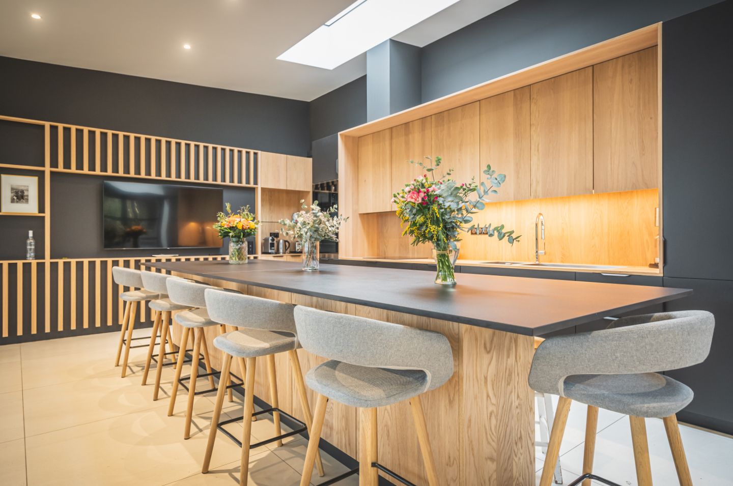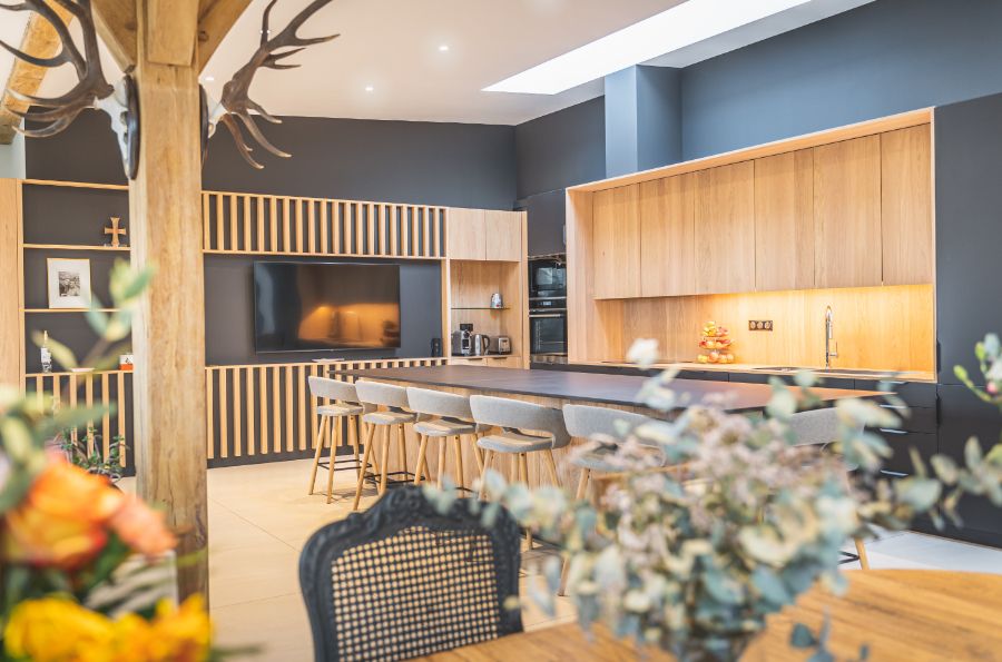Agencement d’une cuisine ouverte, du mural salon et du dressing d’entrée dans le prolongement. Aménagements en chêne massif verni et médium laqué, plan de travail en Dekton.