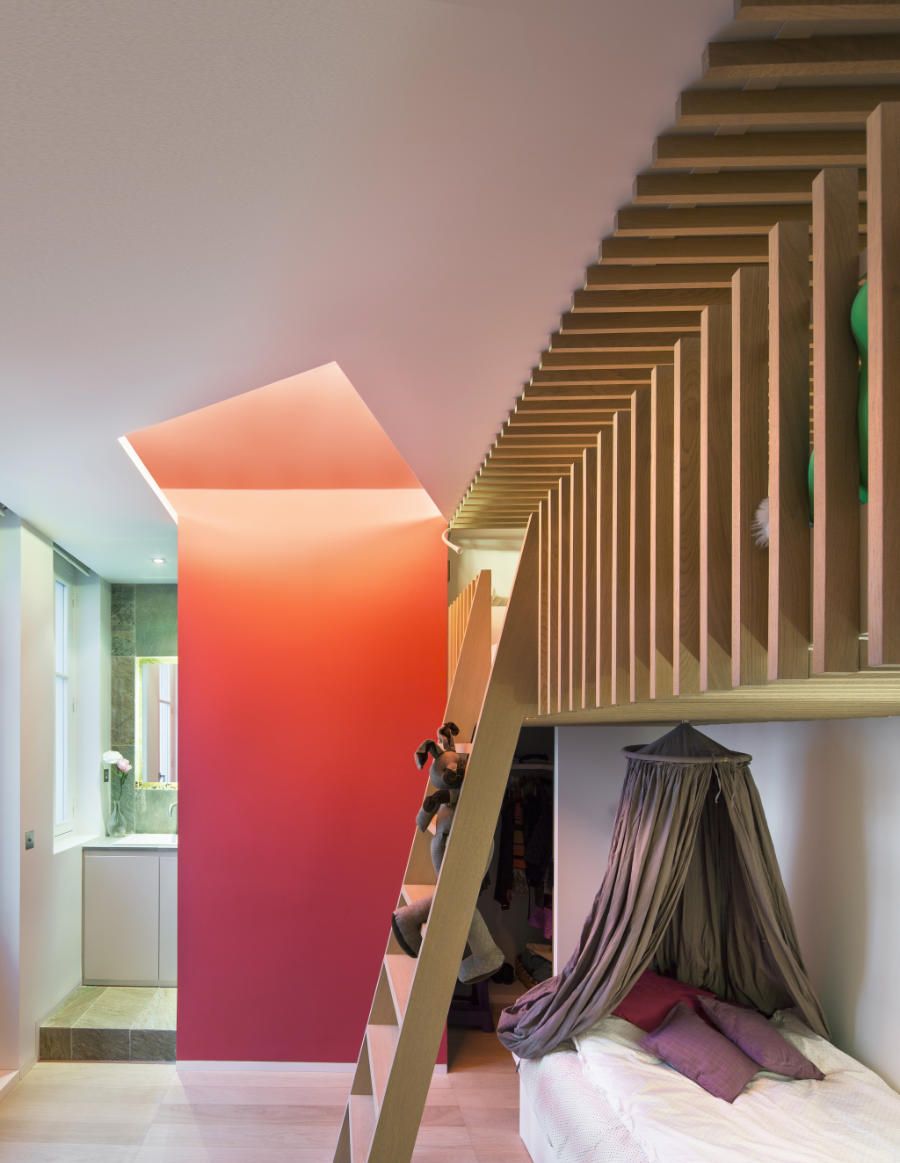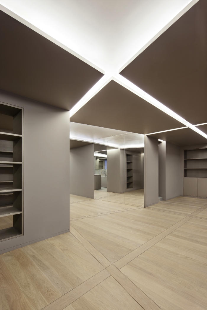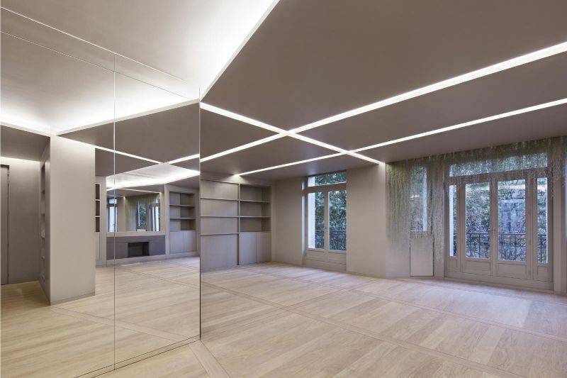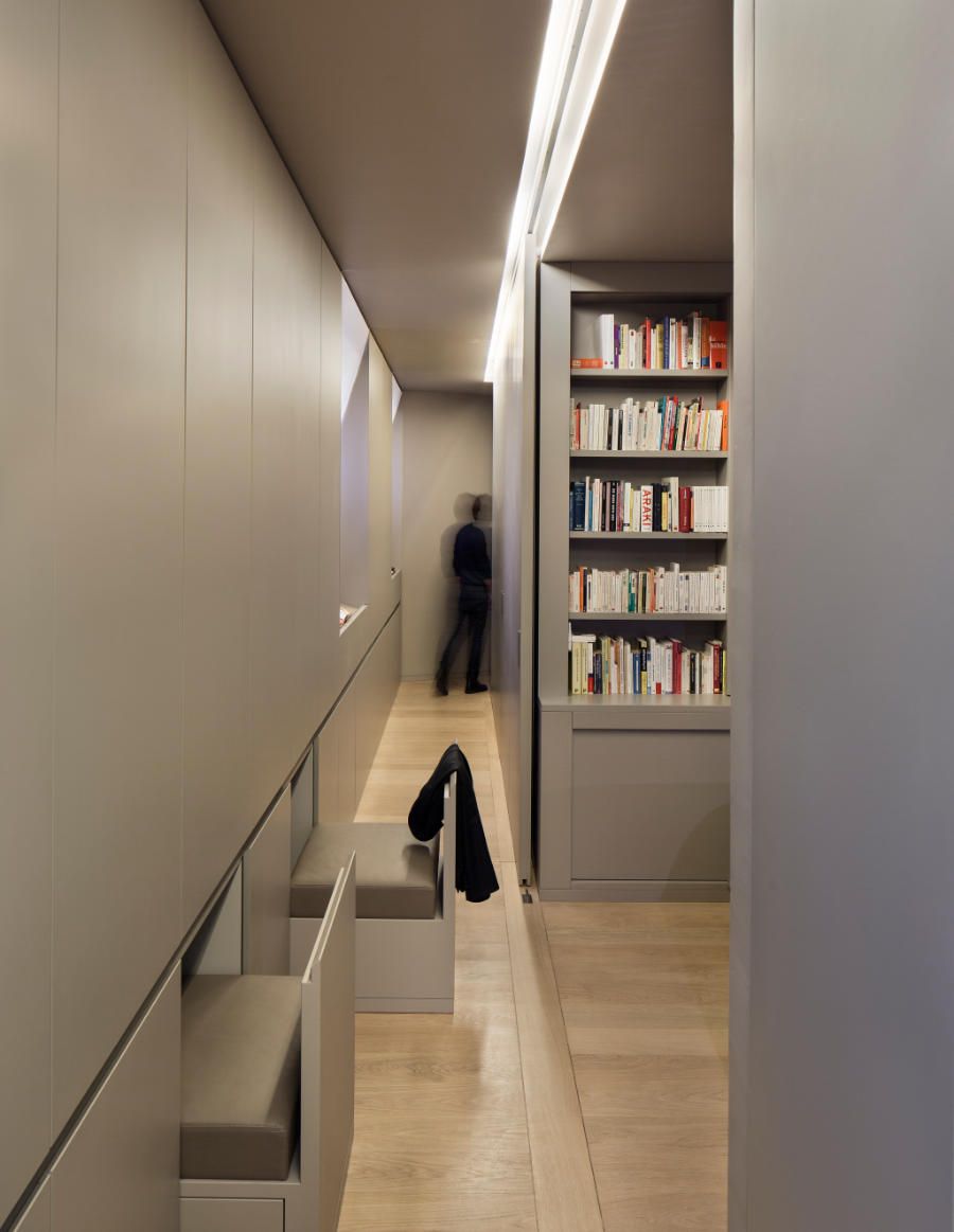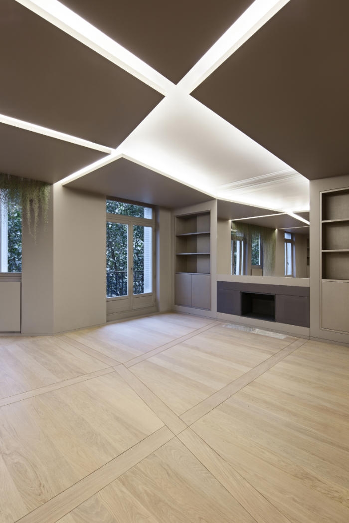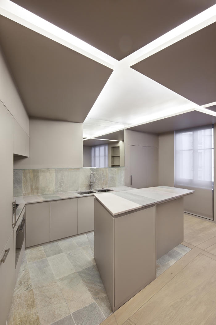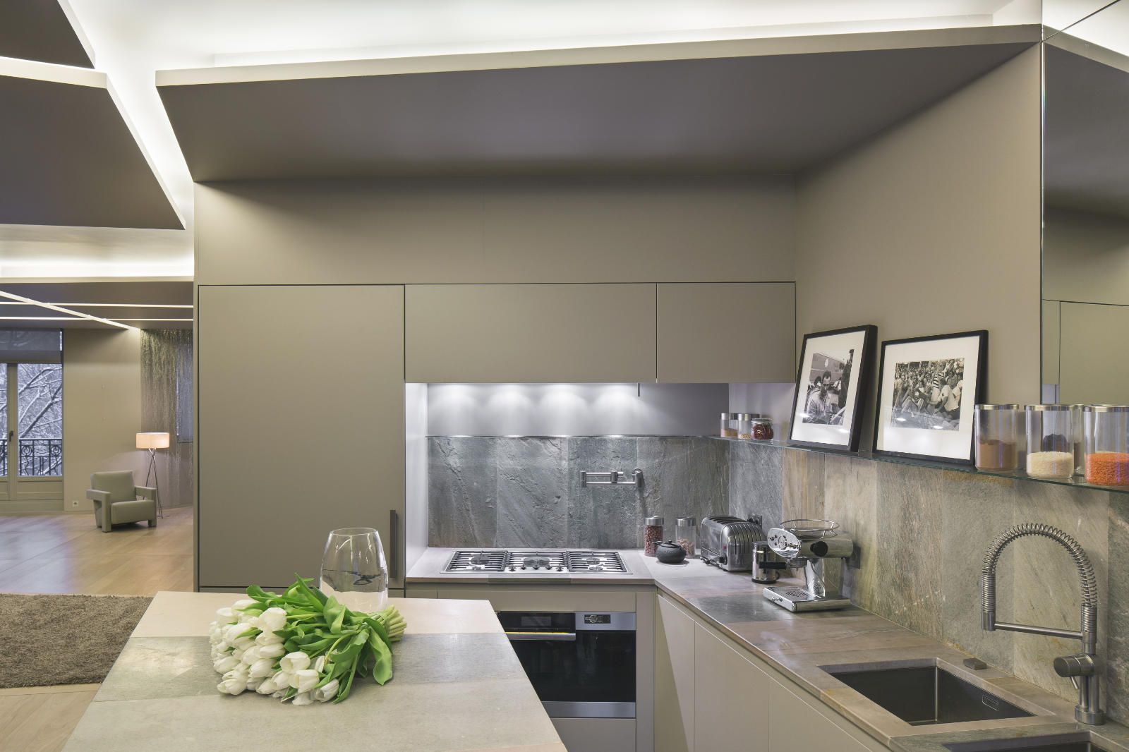 Au pied de la Tour Eiffel. Agencement d’un appartement avenue de la Bourdonnais, bibliothèques, cuisine, dressing, chambres, salles d’eau et cloisons coulissantes. Ensembles laqués mat et texturés, pierre naturelle, chêne massif et cuirs.